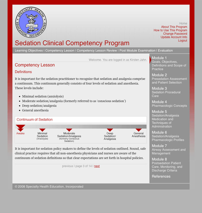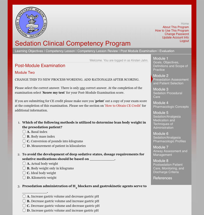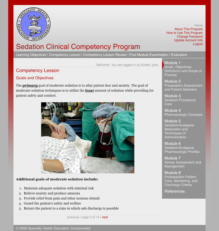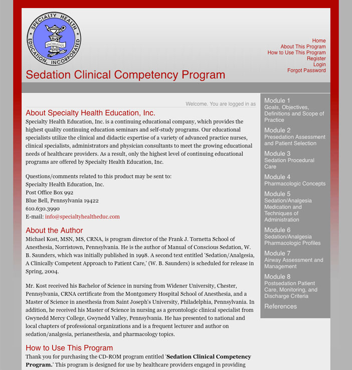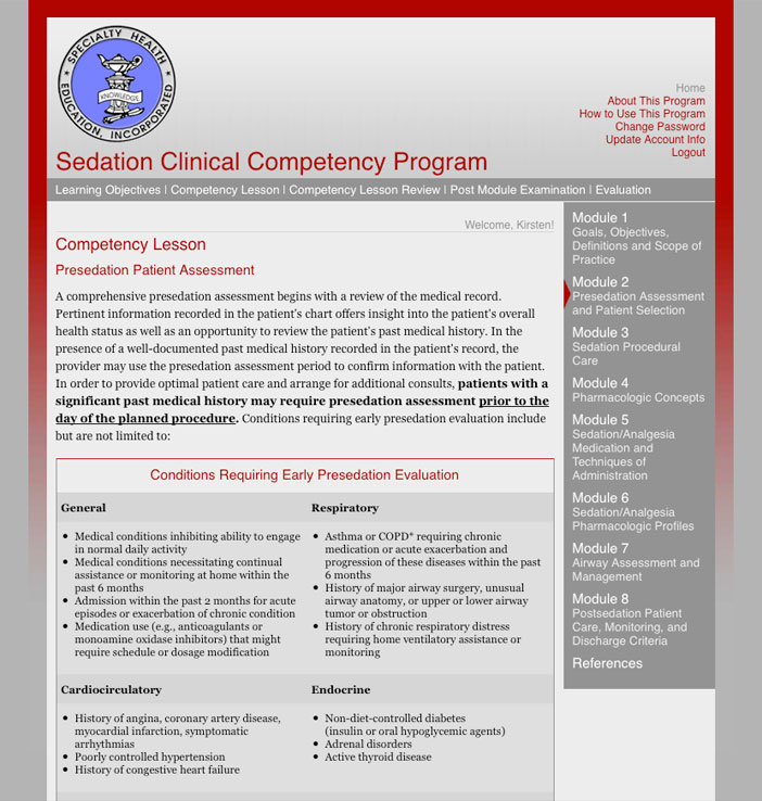 This online continuing education program is designed for use by healthcare providers engaged in providing sedation/analgesia in a variety of practice settings. It was created by Specialty Health Education, Inc.